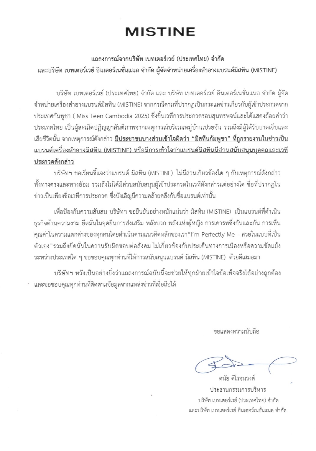 บริษัท เบทเตอร์เวย์ (ประเทศไทย) จำกัด และ บริษัท เบทเตอร์เวย์ อินเตอร์เนชั่นแนล จำกัด ผู้จัดจำหน่ายเครื่องสำอางแบรนด์มิสทิน (MISTINE) จากกรณีตามที่ปรากฏเป็นกระแสข่าวเกี่ยวกับผู้เข้าประกวดจากประเทศกัมพูชา (Miss Teen Cambodia 2025) ซึ่งขึ้นเวทีการประกวดรอบสุนทรพจน์และได้แสดงถ้อยคำว่าประเทศไทย เป็นผู้ละเมิดปฏิญญาสันติภาพจากเหตุการณ์บริเวณหมู่บ้านเปรยจัน รวมถึงมีผู้ได้รับบาดเจ็บและเสียชีวิตนั้น จากเหตุการณ์ดังกล่าว มีประชาชนบางส่วนเข้าใจผิดว่า “มิสทีนกัมพูชา” ที่ถูกรายงานในข่าวเป็นแบรนด์เครื่องสำอางมิสทิน (MISTINE) หรือมีการเข้าใจว่าแบรนด์มิสทินมีส่วนสนับสนุนบุคคลและเวทีประกวดดังกล่าว