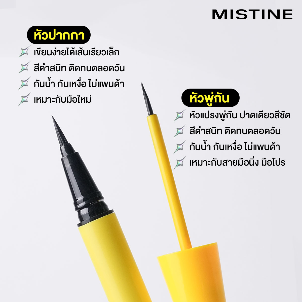 Mistine So Black Eyeliner ทั้ง 2 หัว ที่โดดเด่นเรื่องความติดทน สีดำชัด และไม่แพนด้าระหว่างวัน